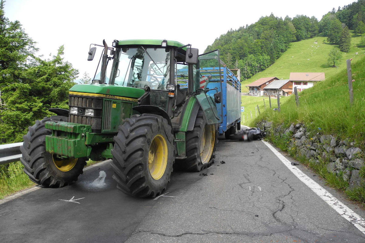Dabei kam ihm im Kurvenbereich unterhalb der Handgruobi ein Traktor entgegen. Trotz eingeleiteter Vollbremsung konnte der Motorradfahrer eine Kollision mit dem stillstehenden Traktor nicht mehr verhindern. In der Folge stürzte der Motorradlenker und zog sich Verletzungen an Knie und Arm zu. Der Verkehr auf der Ibergereggstrasse musste durch die Feuerwehr Stützpunkt Schwyz während rund 90 Minuten umgeleitet werden.