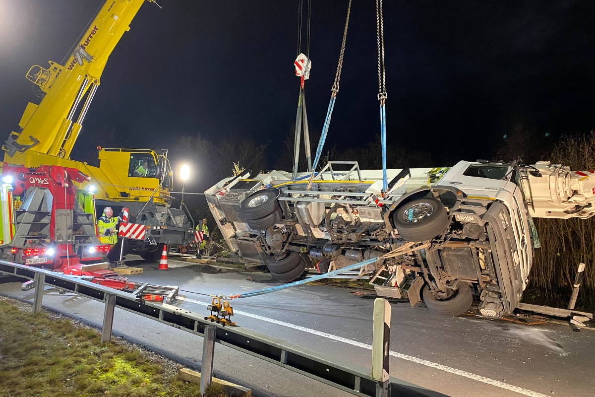 Die Autobahneinfahrt Rotkreuz blieb nach einem Selbstunfall für mehrere Stunden gesperrt. Der verunfallte Kranlastwagen musste von zwei Pneukränen geborgen werden. Für die Verkehrsumleitung standen gleich drei Ortsfeuerwehren im Einsatz.