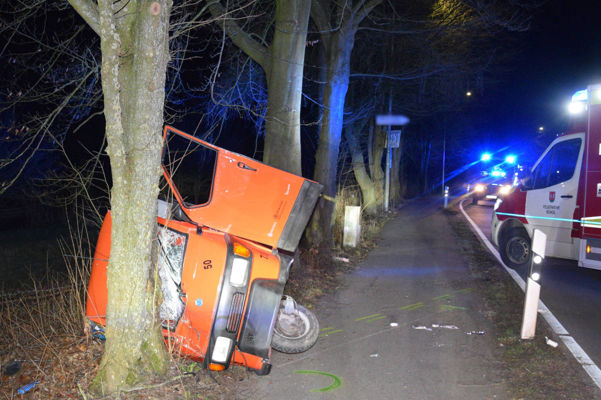 Gegen 1:15 Uhr fuhr ein 17-jähriger Rödinghauser mit seiner Ape der Marke Piaggio auf der Straße im Hafke. Im Führerhaus und auch auf der Ladefläche des dreirädrigen Kleinkraftrads befanden sich zwei weitere Männer im Alter von 16 und 17 Jahren. Im Einmündungsbereich zur Wehmerhorststraße verlor der Fahrer die Kontrolle über sein Fahrzeug und die Piaggio kam nach rechts von der Fahrbahn ab. Das Fahrzeug kollidierte mit einem Baum und kippte auf die Seite.