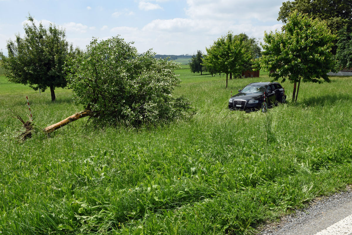 Am Donnerstagnachmittag, 14.06.2018, 13:15 Uhr, fuhr der Lenker eines Personenwagens auf der Bromenstrasse von Römerswil in Richtung Neudorf. In einer Rechtskurve kam er von der Strasse ab, schlitterte über das Wiesland und kollidierte mit einem Apfelbaum. Die Wucht war so gross, dass der Baum entwurzelt wurde. Der 25-jährige Junglenker und sein Beifahrer blieben unverletzt. Es entstand Sachschaden in der Höhe von 40‘000 Franken.