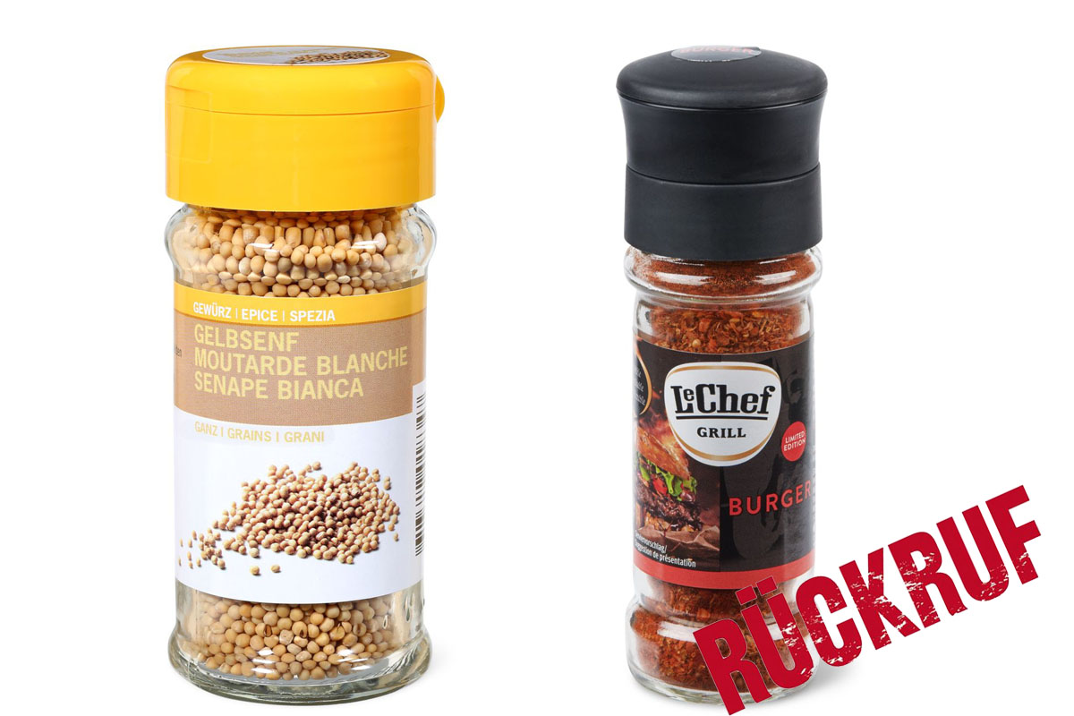 Die Migros ruft die Gewürze «LeChef Burger Mühle 43G» und «Gelbsenf ganz 50G» zurück (Bildquelle: Migros Genossenschafts Bund)