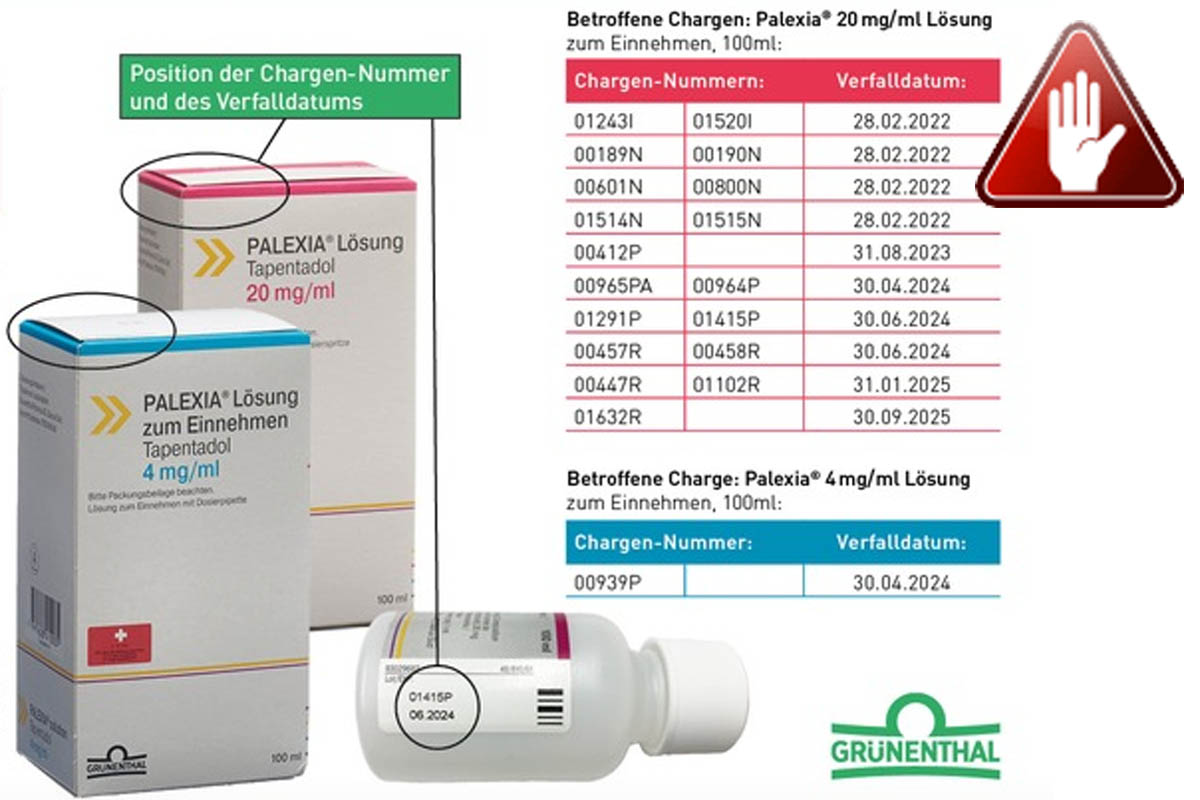 In Absprache mit dem Schweizerischen Heilmittelinstitut Swissmedic ruft die Grünenthal Pharma AG alle Chargen mit Restlaufzeit der Arzneimittel Palexia®, 20mg/ml Lösung zum Einnehmen, 100ml und Palexia®, 4mg/ml Lösung zum Einnehmen, 100ml zurück. Siehe Auflistung in der Tabelle.