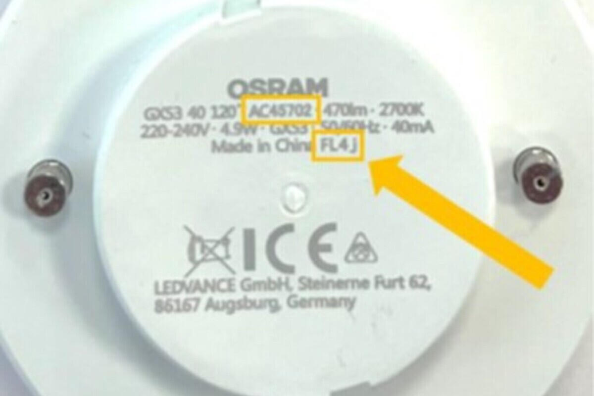 Produktionslos und Artikelnummer auf der Lampenrückseite kennzeichnen die betroffenen Modelle (Bildquelle: Eidgenössisches Büro für Konsumentenfragen)