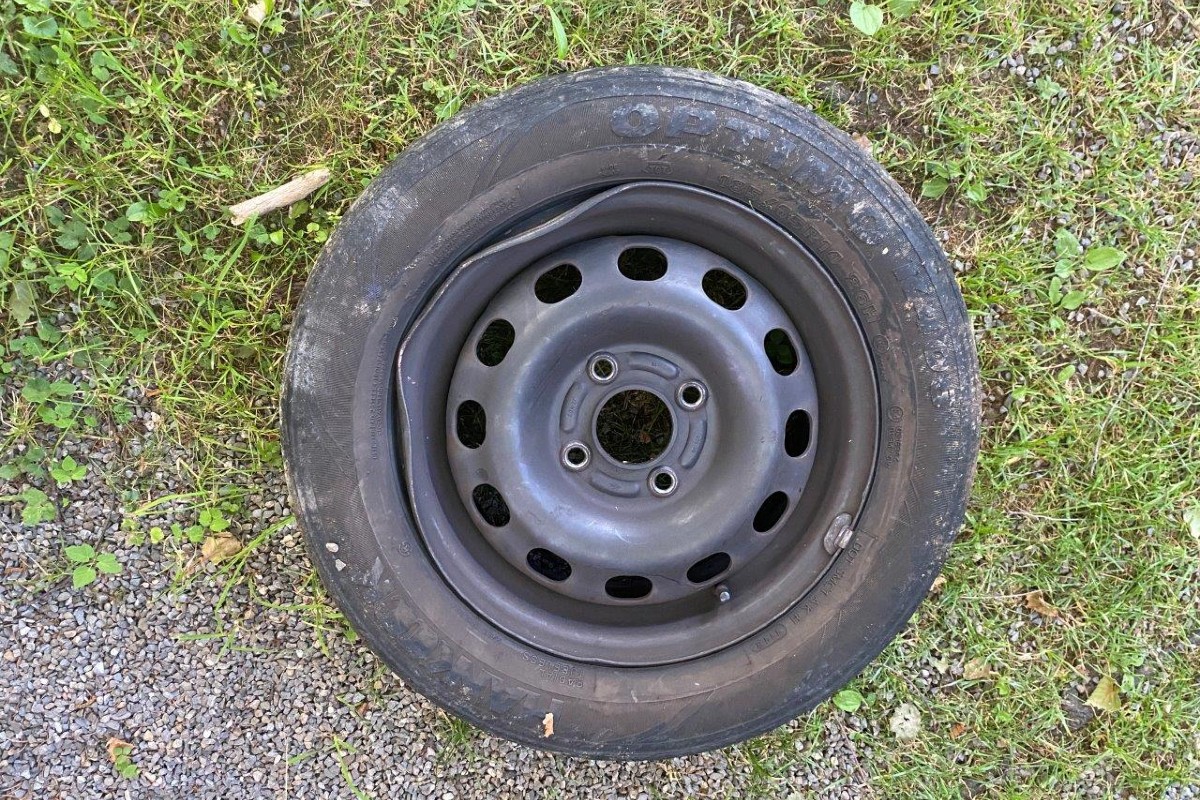 Beim Rad handelt es sich um eine Stahlfelge mit einem abgefahrenen Sommerreifen der Marke HANKOOK OPTIMO K406 in der Dimension 185/65 R14 86H.