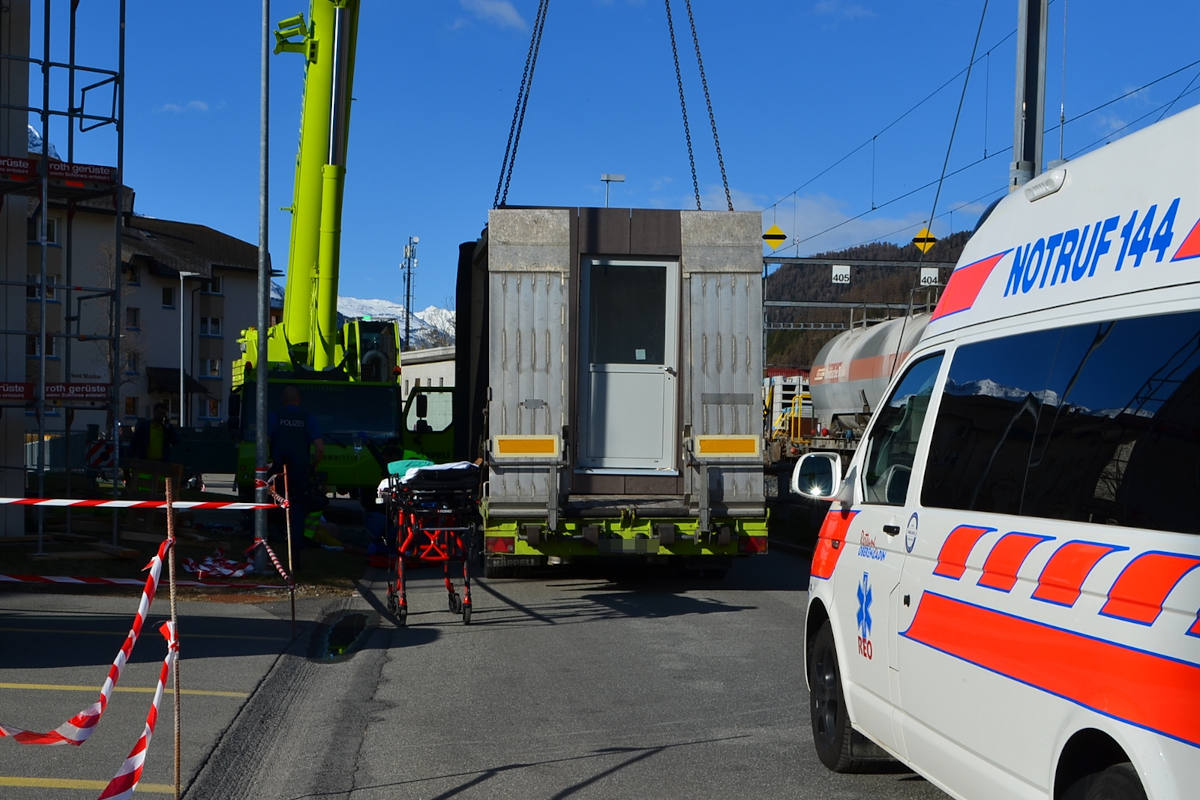 Auf der Baustelle in Promulins luden Arbeiter kurz vor 8 Uhr mit einem Kran Holzmodule von einem Lastwagen ab. An einem der Module blieb ein Vierkantholz, welches die Lastwagenbrücke während des Transports schützt, haften. Das Vierkantholz löste sich aus einer Höhe von sieben Metern und traf den 40-jährigen Lastwagenchauffeur, der sich neben dem Fahrzeug befand, am Kopf.