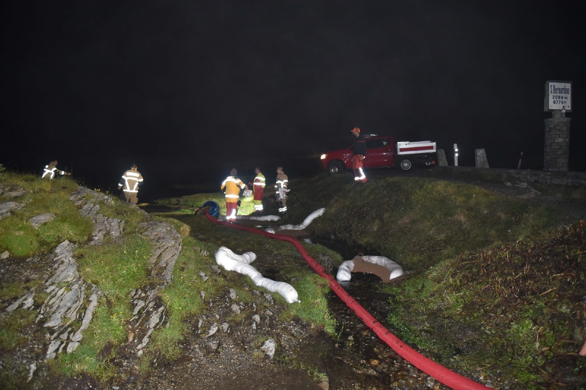 Rund 800 Liter Diesel waren gestern aus dem Keller des Hospiz in San Bernardino ins Erdreich und in den See gelangt. Die Oelwehr Roveredo und die Feuerwehr Alta Mesolcina, die mit je drei Personen vor Ort waren, richteten Ölsperren ein und setzten Bindemittel ein.
