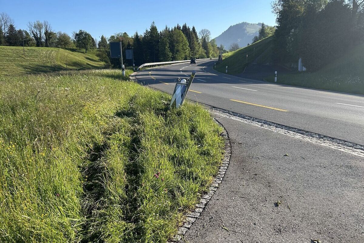 In der Nacht auf Freitag, 10. Mai 2024, ist ein Autofahrer auf der Schlagstrasse beim Erlirank in Sattel mit einem Leitpfosten und einer Signalisationstafel kollidiert. Die Polizei sucht nun nach Zeugen.