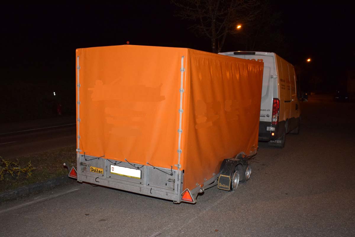 Kurze Zeit später konnte eine Patrouille den Lieferwagen mit Anhänger abgestellt vor einem Geschäftsgebäude in Schachen bei Herisau antreffen. Dabei stellten die ausrückenden Polizisten fest, dass zwei Reifen auf der rechten Seite des Anhängers geplatzt und die Felgen massiv beschädigt waren.