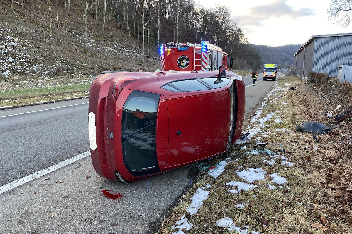 Am Sonntag (23.01.2022), kurz vor 16:00 Uhr, fuhr eine 55-jährige Personenwagenlenkerin von Bargen kommend auf der Hauptstrasse H4 in Fahrtrichtung Schaffhausen. Aus bisher unbekannten Gründen geriet das Fahrzeug linksseitig ab der Strasse, woraufhin es mit dem Abgrenzungszaun kollidierte. Durch die Kollision überschlug sich das Fahrzeug und kam schlussendlich am linken Strassenrand zum Stehen.