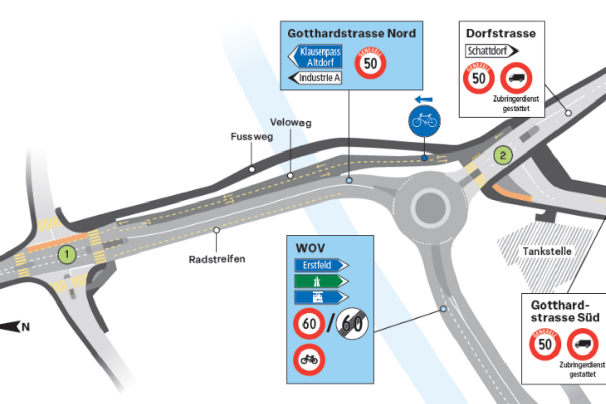 Der Veloverkehr hat von Altdorf in Richtung Schattdorf mehrere Optionen (siehe Grafik mit den vier Kästchen). Velos fahren auf dem Radstreifen der Gotthardstrasse, durchqueren den Kreisel Schächen und biegen anschliessend in die Dorf- oder Gotthardstrasse ein. Alternativ können sie auch den neuen Veloweg auf der anderen Strassenseite benutzen. Eine andere Regelung gilt für Velos, die von Schattdorf in Richtung Altdorf fahren: Sie müssen den Veloweg benutzen.