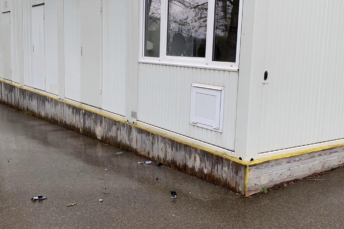 Scheibe eines Bürocontainers beim Schulhaus Emmersberg in Schaffhausen mutwillig zerstört