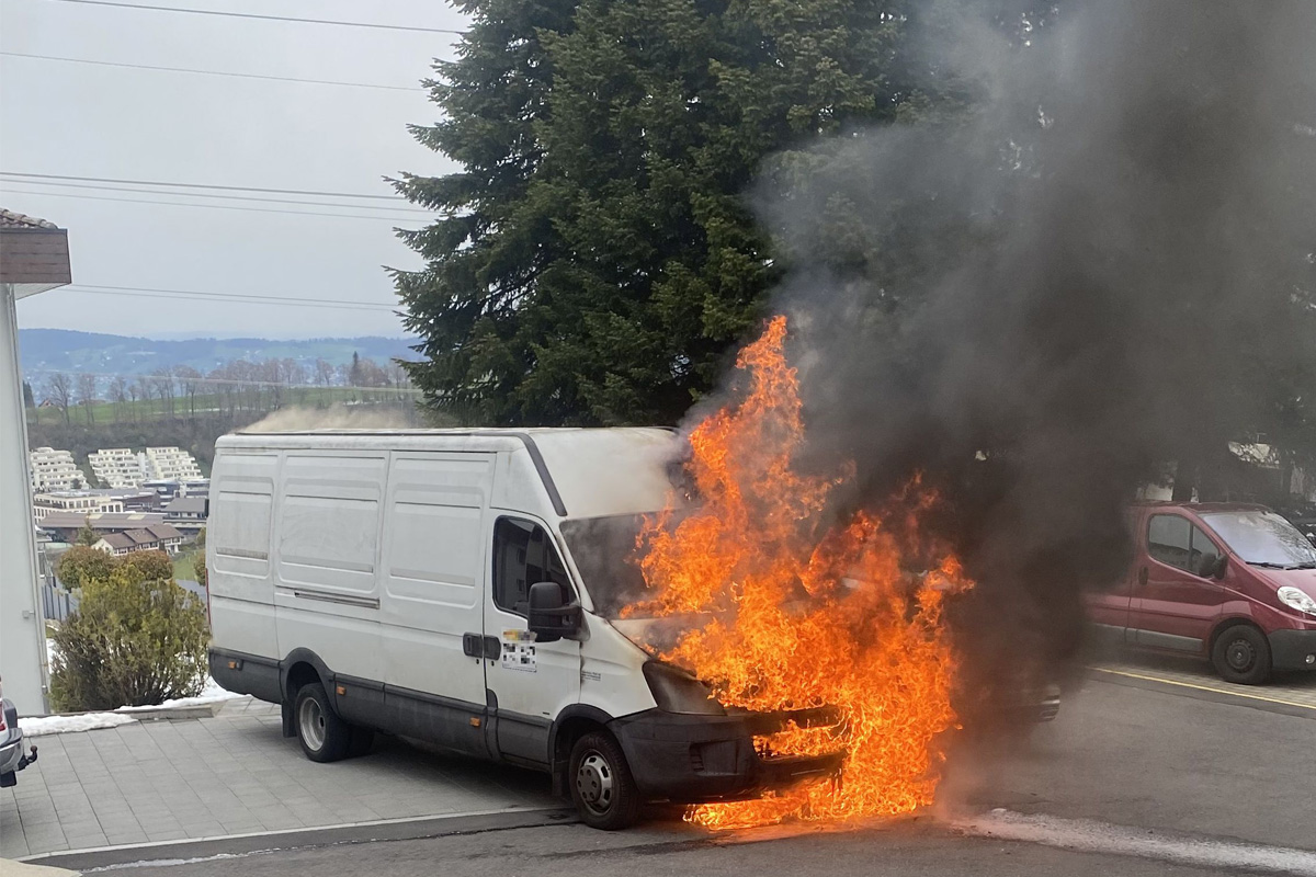 Ein 53-jähriger Mann fuhr mit einem Lieferwagen auf den Vorplatz einer Liegenschaft an der Aeschstrasse, als er Rauch im Motorraum bemerkte. Kurz darauf brach ein Feuer aus.