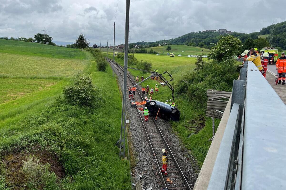 Am Dienstagnachmittag (21.5.2024) stürzte nach einem Selbstunfall in Schöfflisdorf ein Auto auf die Gleise. Der Lenker verletzte sich dabei.