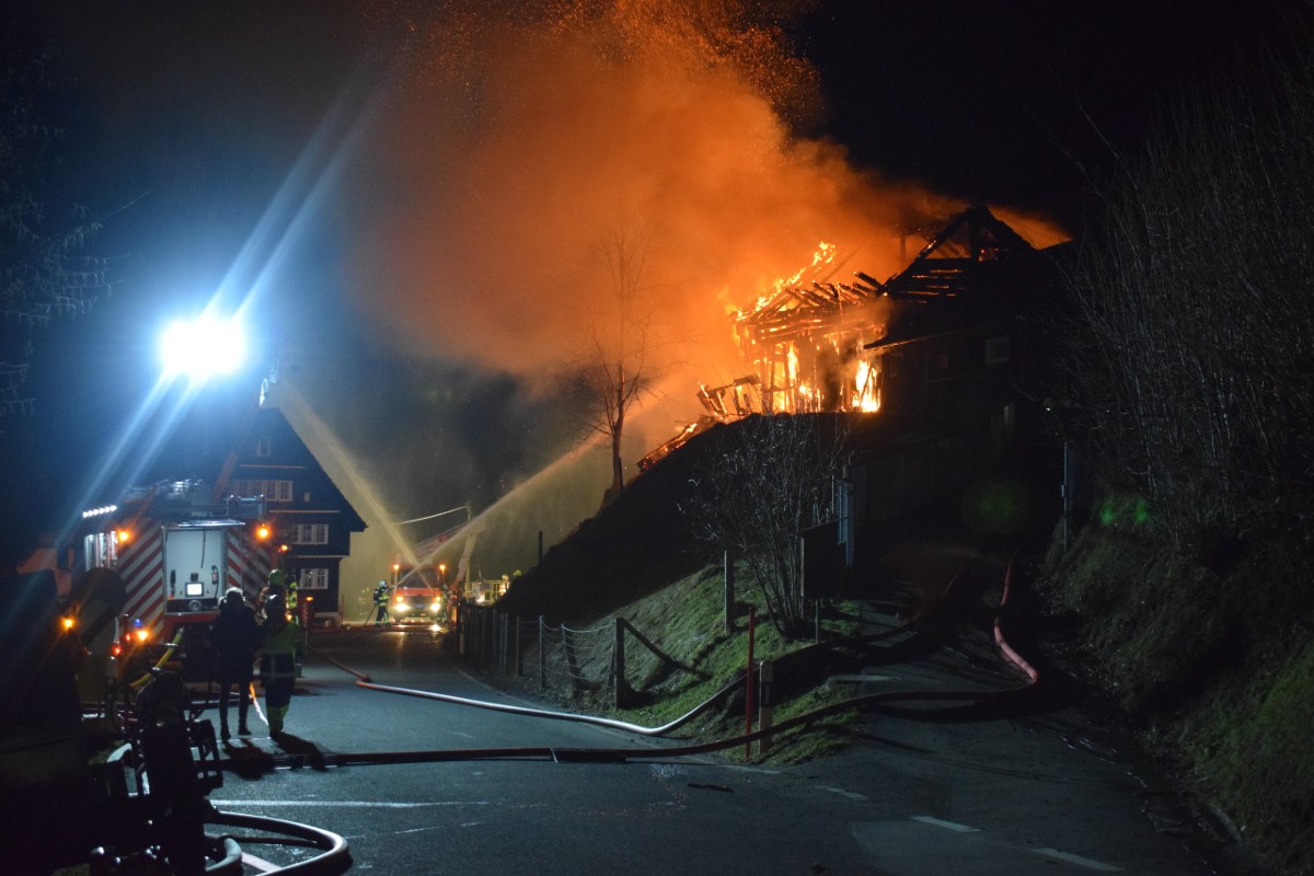 Kurz nach 00.20 Uhr ging bei der Kantonalen Notrufzentrale die Meldung ein, dass es im Dachstock eines Hauses an der Unteren Müli in Schwellbrunn brennen würde. Beim Eintreffen der ersten Einsatzkräfte musste leider festgestellt werden, dass sich das Feuer bereits auf mehrere Stockwerke ausgebreitet hatte und das Wohnhaus mit dem angebauten Stall nicht mehr gerettet werden konnte.