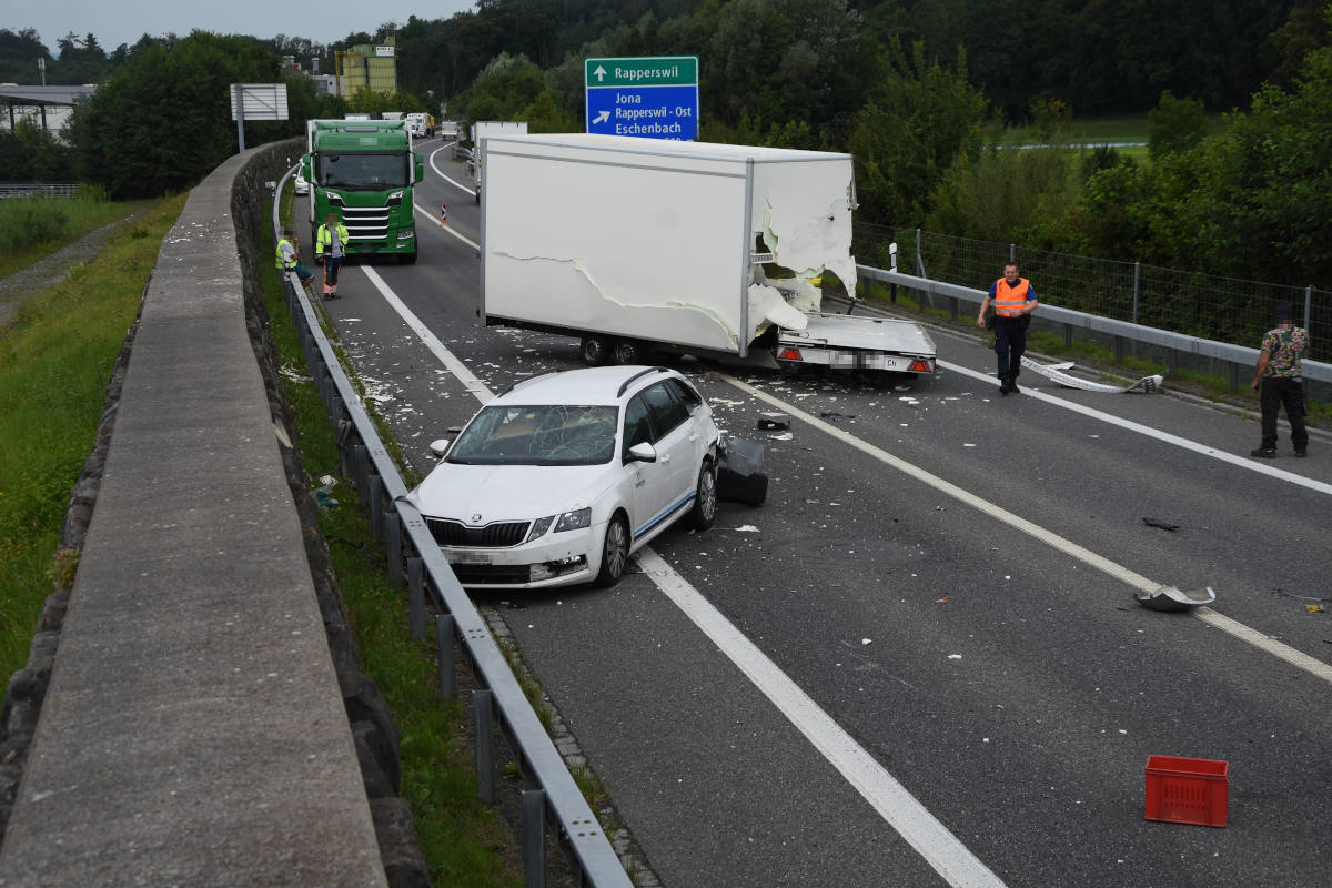 Ein 44-jähriger Chauffeur fuhr mit seinem Lieferwagen mit angehängtem Sachentransportanhänger auf der Autobahn A15 in Richtung Hinwil. Kurz vor der Ausfahrt Jona löste sich aus bislang unbekannten Gründen der Anhänger vom Lieferwagen. Der Anhänger geriet auf den Gegenfahrstreifen und kollidierte mit der Front des entgegenkommenden Pickups des 67-Jährigen.