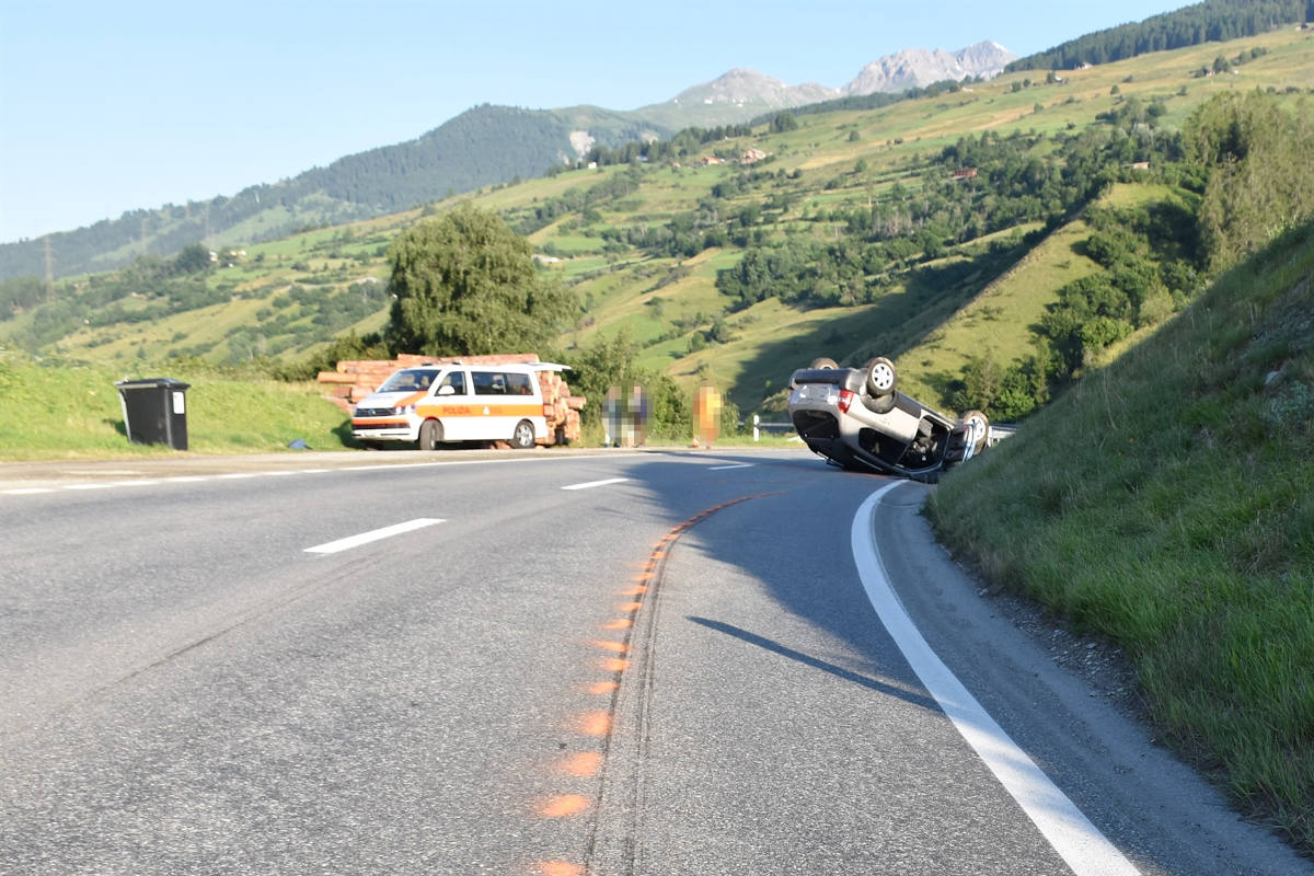 Das Fahrzeug geriet dadurch ins Schleudern, kollidierte mit der rechtsseitigen Böschung und kippte auf das Dach. Die Kantonspolizei Graubünden klärt die genaue Unfallursache ab.