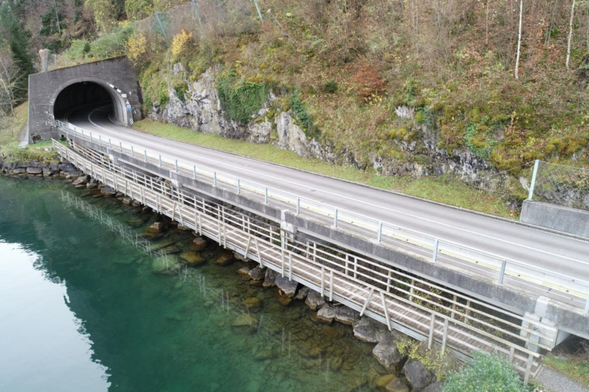 Die Stelle der Bauerstrasse beim Ausgang des Harderbandtunnels, an der die Anker ersetzt werden müssen (Bildquelle: Baudirektion Uri)