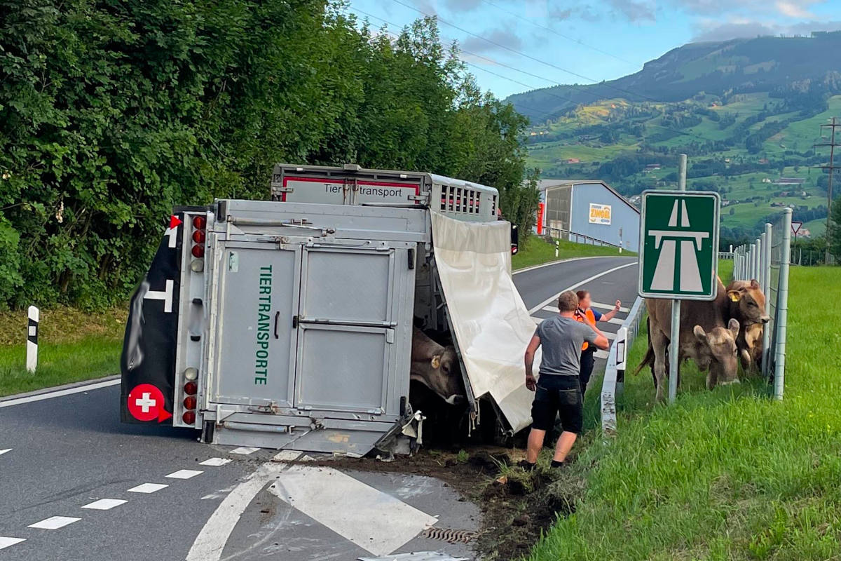 Ein 23-jähriger Lastwagenfahrer bog kurz nach 6:30 Uhr von Lauerz kommend nach links in die Einfahrt ein. Dabei kippte sein Anhänger um. Das darin befindliche Dutzend Kühe und Rinder blieb unverletzt. Die Autobahneinfahrt musste für die Bergung des Anhängers bis um 9:45 Uhr gesperrt wurden.