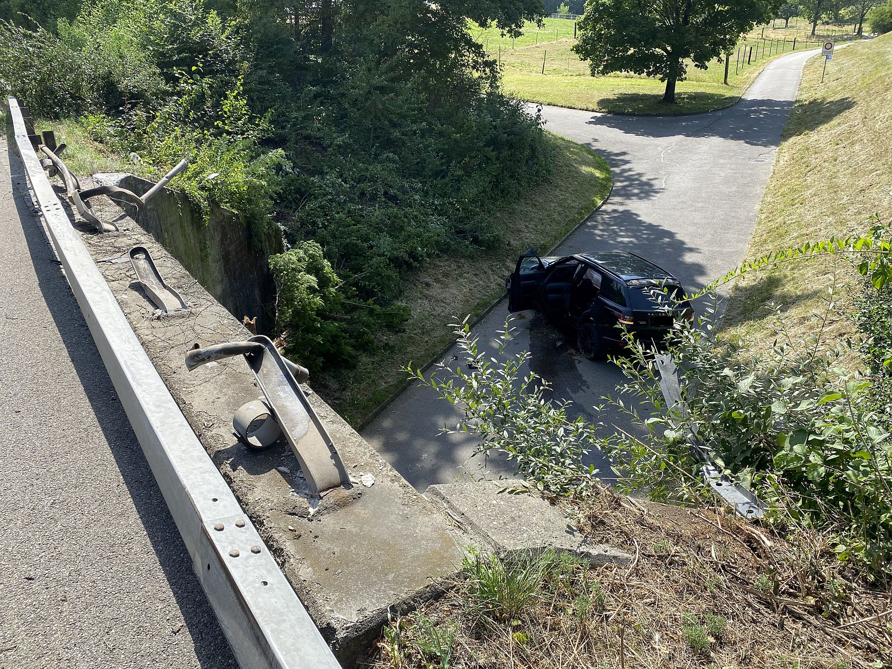 Fahrzeug in der abfallenden Strassenböschung und kam schlussendlich, wieder auf den Rädern