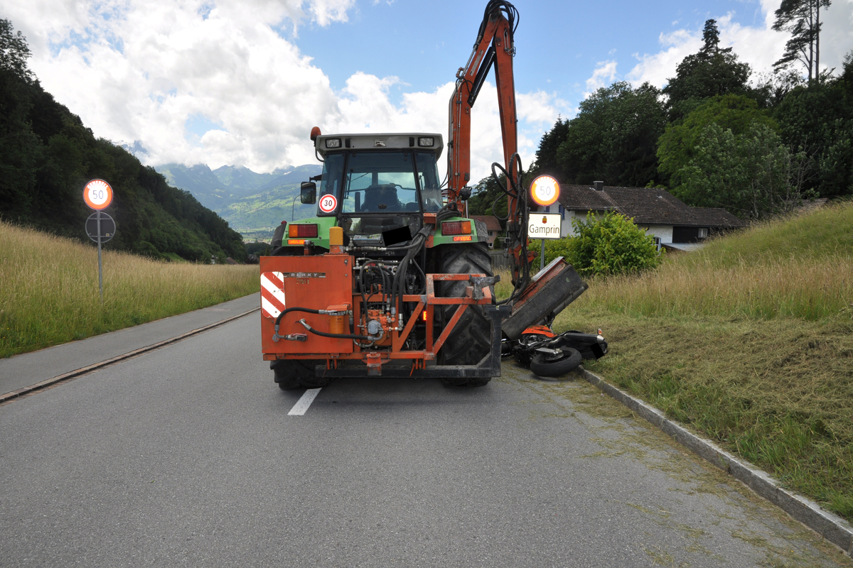 Am Dienstagnachmittag ereignete sich ein Unfall eines Motorradlenkers in Gamprin. Der 21-Jährige fuhr mit seinem Motorrad kurz nach 13.30 Uhr auf der Strasse Oberbühl talwärts. Aufgrund eines Arbeitskarren, welcher auf der Fahrbahn stand und mit Mäharbeiten im angrenzenden Wiesland beschäftigt war, erschrak der Motorradlenker und verlor die Beherrschung über sein Zweirad. Daraufhin kam er zu Fall und zog sich Verletzungen zu, an den beiden Fahrzeugen entstand Sachschaden.