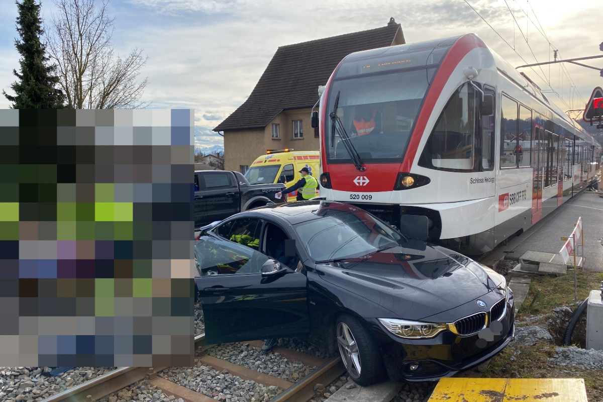 In Seon AG kam es heute zu einem Unfall zwischen einem BMW und der Bahn. (Bildquelle: Kantonspolizei Aargau)