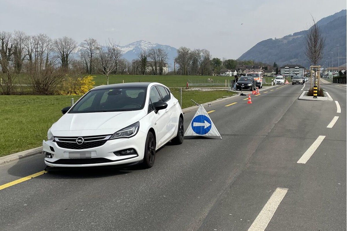 Kurz zuvor kam es auf dem Fussgängerstreifen beim Gross-Kreisel in Siebnen im Bereich Zürcherstrasse zu einer beinahe Kollision zwischen dem weissen Opel Astra und einer unbekannten Fussgängerin.