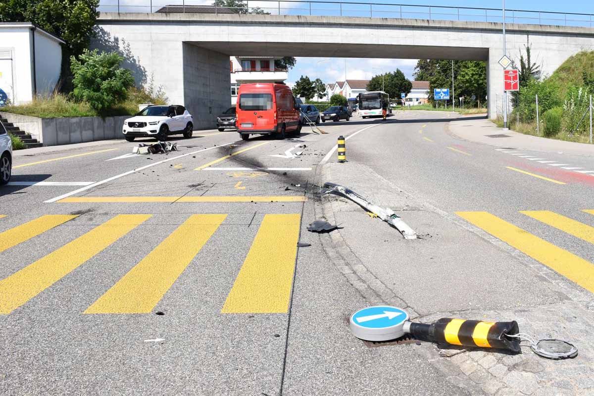 Bei der Lichtsignalanlage Gibelin-/Allmendstrasse soll gleichzeitig ein unbekannter Fahrradlenker die Kreuzung befahren haben, worauf der Lieferwagenlenker erschrak. In der Folge kam es zu einer Kollision mit einem Kandelaber und der Lichtsignalanlage.