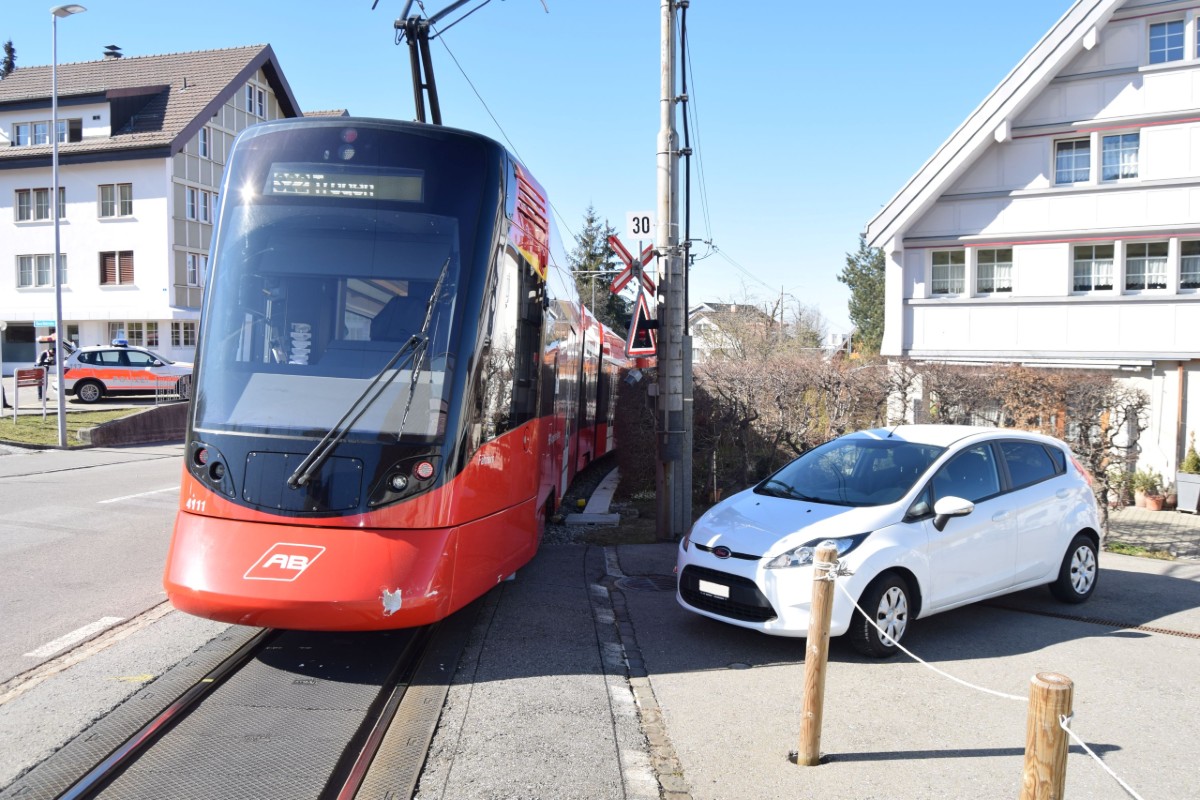 Am Dienstag, 2. März 2021, ist es in Speicher zu einem Verkehrsunfall zwischen einer Zugskomposition der Appenzeller Bahnen und einem Personenwagen gekommen. Es entstand Sachschaden. Personen blieben unverletzt.