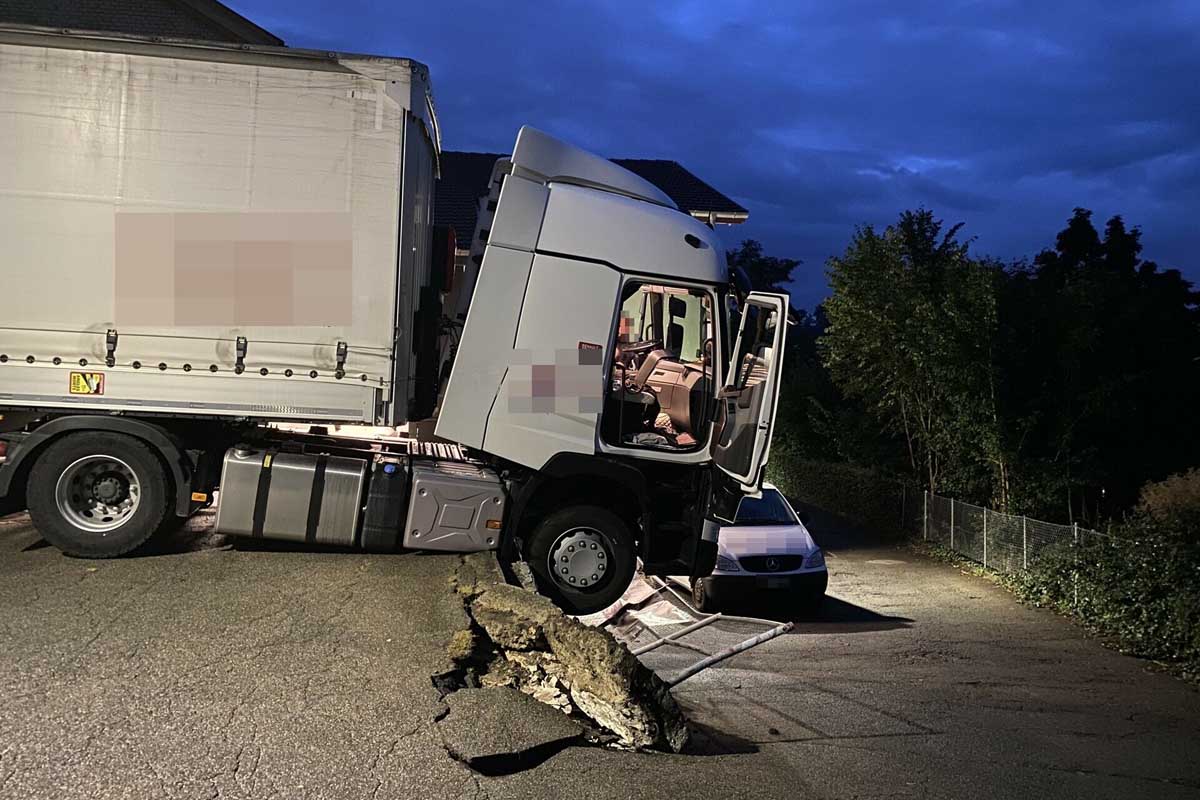 Dabei kollidierte er mit einem parkierten Fahrzeug, anschliessend mit verschiedenen Gegenständen und zu Schluss mit einem Zaun, dabei geriet die Vorderachse des Sattelmotorfahrzeugs über die dortige Stützmauer. Dadurch war das Sattelmotorfahrzeug blockiert und der Lenker konnte sich nicht mehr selbständig aus der prekären Lage befreien.