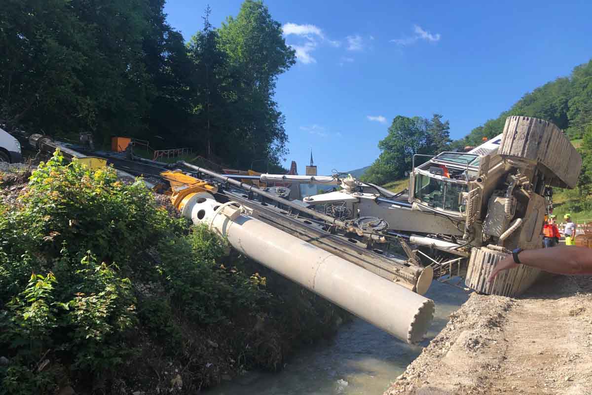 Spektakulärer Unfall in Niederdorf BL - 100 Tonnen schwerer Bohrbagger kippt bei Bohrarbeiten