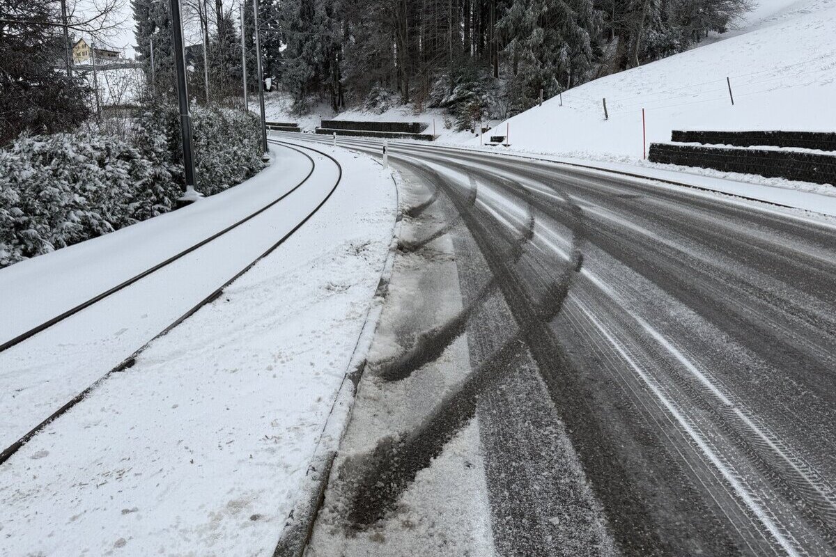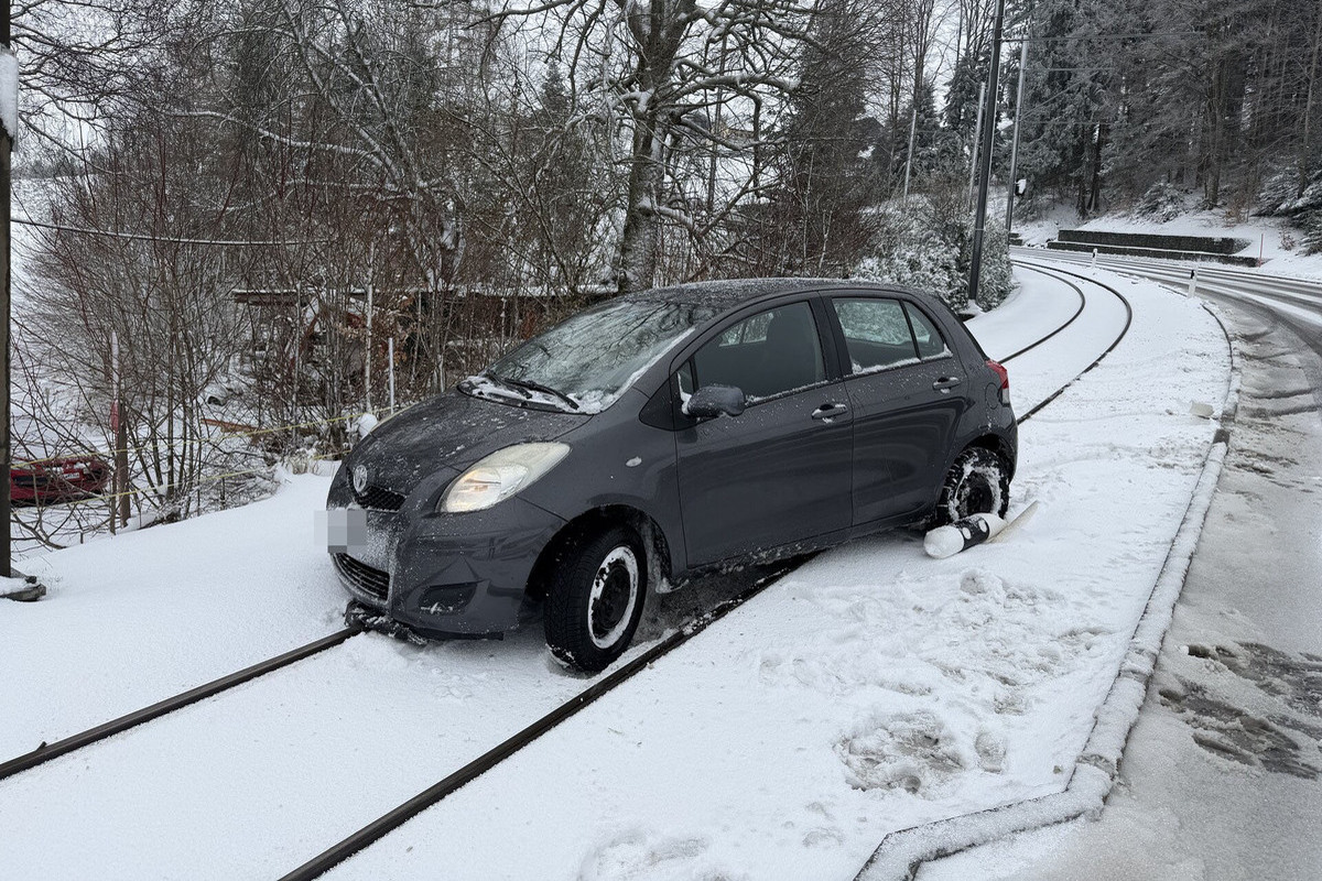 Eine Autofahrerin ist auf schneebedeckter Strasse ins Schleudern geraten und auf den Gleisen zum Stillstand gekommen. Die Bahnlinie war kurzzeitig blockiert.