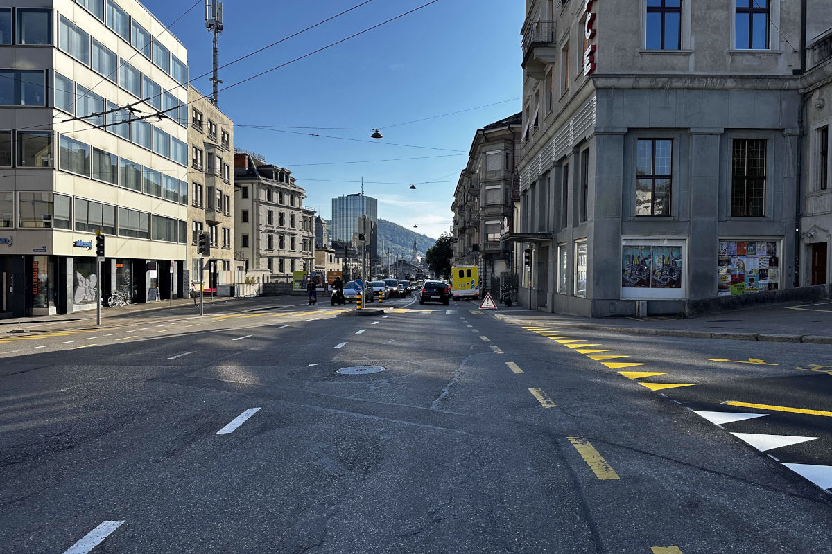 Kurz nach der Kreuzung Blumenbergplatz, auf der Höhe des Kinos Palace, lief laut Angaben des E-Scooter-Fahrers ein unbekannter Fussgänger bei Rot über den Fussgängerstreifen. Infolgedessen kollidierten sie und der E-Scooter-Fahrer stürzte. Er wurde anschliessend mit leichten Verletzungen ins Spital gebracht.