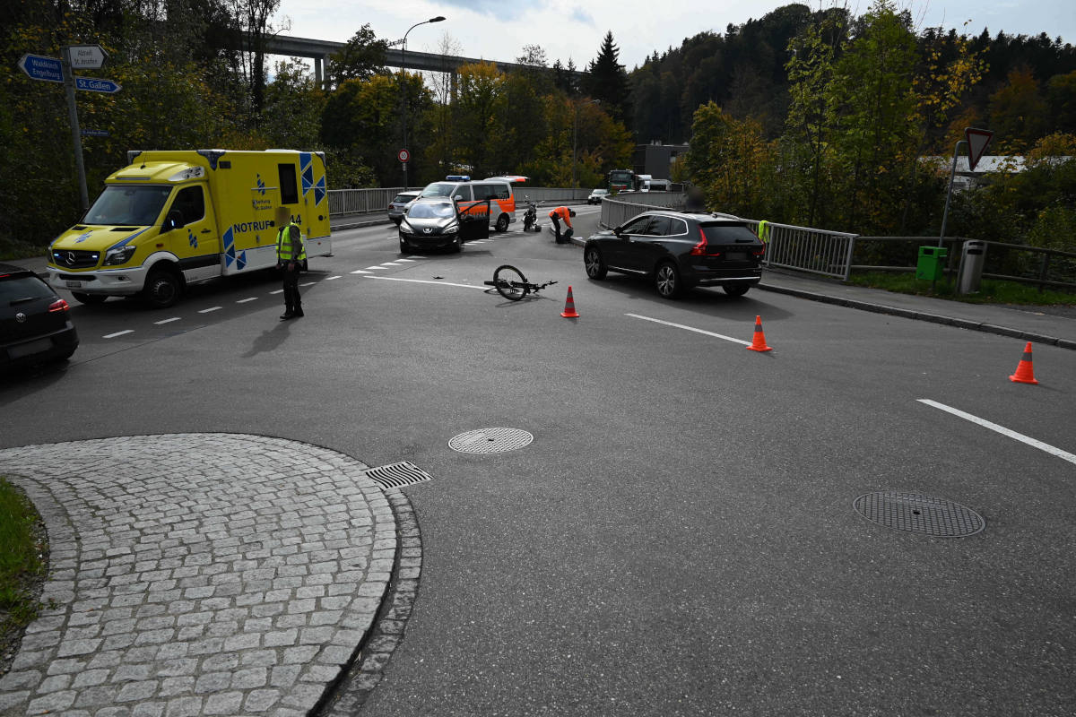 Am Donnerstag (13.10.2022), kurz vor 13:15 Uhr, ist es auf der St.Gallerstrasse zu einem Unfall zwischen einem Auto und einem Mann auf einem E-Bike gekommen. Ein 61-jähriger E-Bike-Fahrer wurde dabei unbestimmt verletzt. Der Rettungsdienst brachte ihn ins Spital. Der Sachschaden beträgt rund 8'000 Franken.