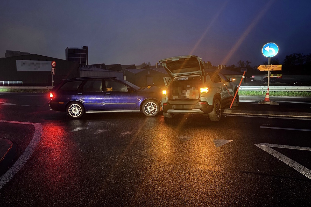 Ein 62-jähriger Mann fuhr mit seinem Auto auf der Autobahn A1 von Rheineck Richtung Au und verliess die Autobahn bei der Ausfahrt St. Margrethen. Nach der Ausfahrt beabsichtigte er, nach links in Richtung Kreisel Neudorfstrasse abzubiegen. Zur gleichen Zeit befuhr ein 50-jähriger Mann mit seinem Auto vom Kreisel Neudorfstrasse her die Autobahneinfahrt in Richtung St. Gallen. Dabei kam es zur Kollision zwischen den beiden Autos.