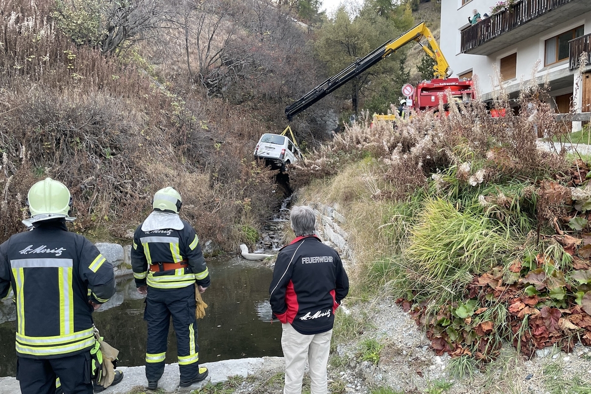 Am Dienstag kam in St. Moritz ein Autofahrer von einer Nebenstrasse ab. Sein Fahrzeug kam in einem Bach zum Stillstand.