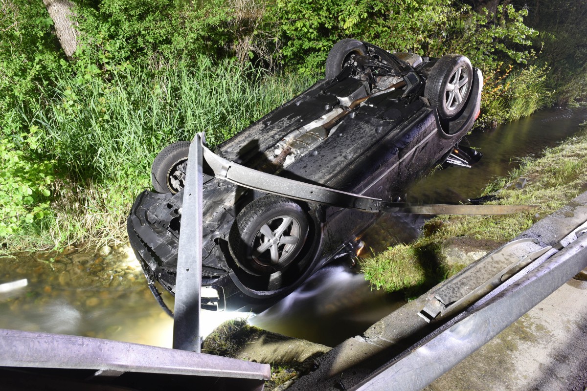 Dabei verlor er die Kontrolle über das Auto. Das Fahrzeug kam von der Strasse ab, durchschlug eine Leitplanke und landete in einem Bachbett. Der 24-jährige Unfallfahrer blieb unverletzt.