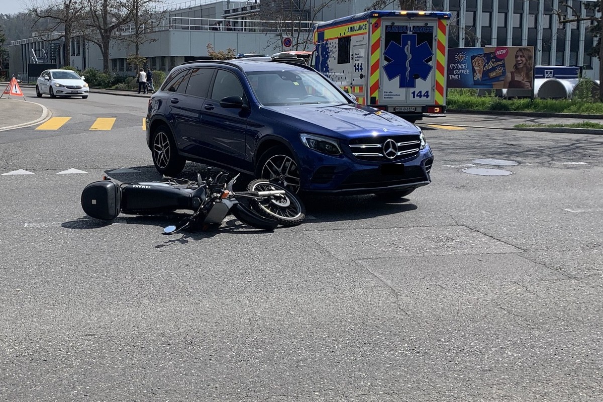 Am Mittwochmittag (28.04.2021) kollidierte in der Stadt Schaffhausen ein Auto mit einem Motorrad, wobei der Motorradfahrer verletzt wurde.