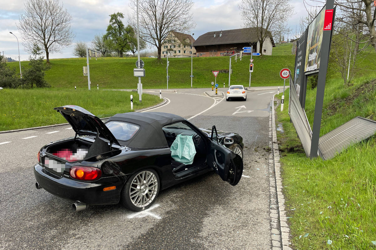 Am Samstagabend, kurz nach 18:30 Uhr, kam es auf der Verzweigung Appenzeller Strasse/Biderstrasse zu einem Selbstunfall. Ein 20-jähriger Autofahrer, welcher auf der Appenzeller Strasse Richtung Herisau unterwegs war, wollte in die Biderstrasse abbiegen. Dabei war er gemäss eigenen Aussagen aufgrund einer Diskussion mit der 17-jährigen Beifahrerin derart abgelenkt, dass er die Kontrolle über das Fahrzeug verlor und mit einer Werbetafel kollidierte.