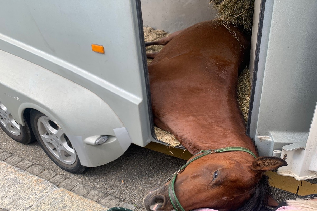 Das Pferd gelang so mit dem Kopf unter die Stange, an der es befestigt war, klemmte sich quer im Anhänger ein und stürzte. Die 40-jährige Fahrerin merkte, dass etwas mit dem Pferd nicht stimmte und hielt an.