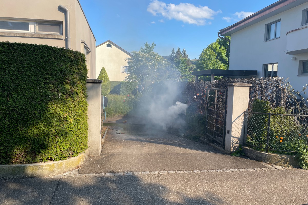 Dabei ist mit hoher Wahrscheinlichkeit ein Funken gesprungen und es kam innert Sekunden zum Vollbrand der Thujahecke. Es entstand eher geringer Sachschaden.