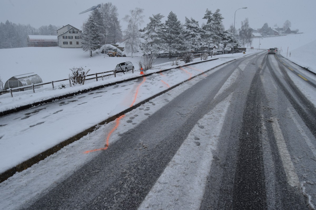 In Stein AR kam es heute zu einem Unfall auf schneebedeckter Strasse. (Bildquelle: Kantonspolizei Appenzell Ausserrhoden)
