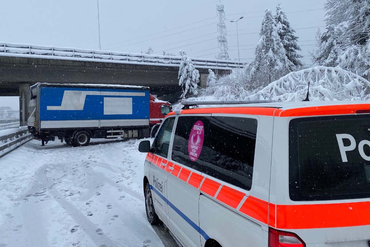 Grund ist ein Lastwagen, welcher quer in der Einfahrt steht. Die Bergungsarbeiten vor Ort sind im Gang.