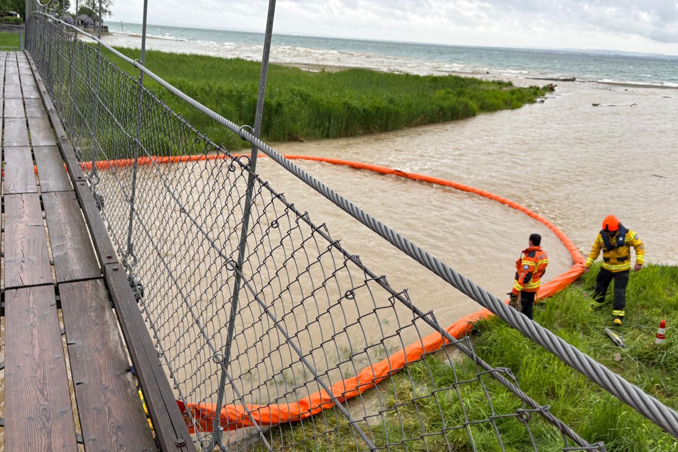 Die Feuerwehr errichtete wegen des starken Wellengangs im See eine Wassersperre in der Steinach, kurz vor dem Einlauf Bodensee.
