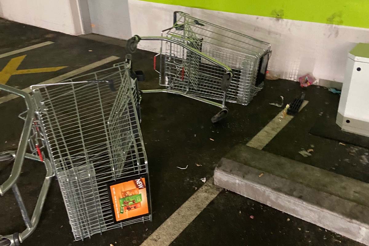 In St.Gallen wurden Einkaufswagen, Glasscheiben sowie Absperrpfosten beschädigt (Bildquelle: Kantonspolizei St.Gallen)