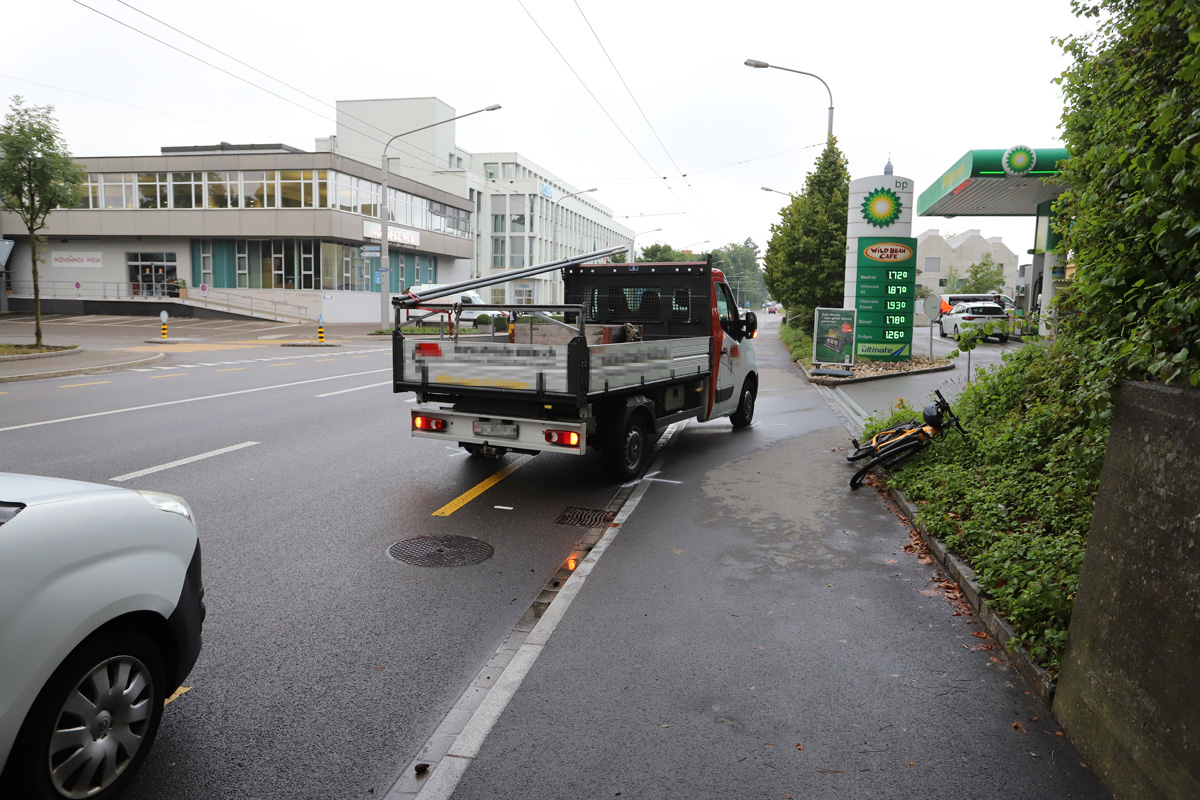 Am Dienstag (31.08.2021) kam es an der Rorschacher Strasse zu einer Kollision zwischen einem Lieferwagen und einem Mann auf einem E-Bike. Der E-Bike-Fahrer stürzte dabei und verletzte sich leicht. Es entstand Sachschaden an beiden Fahrzeugen.