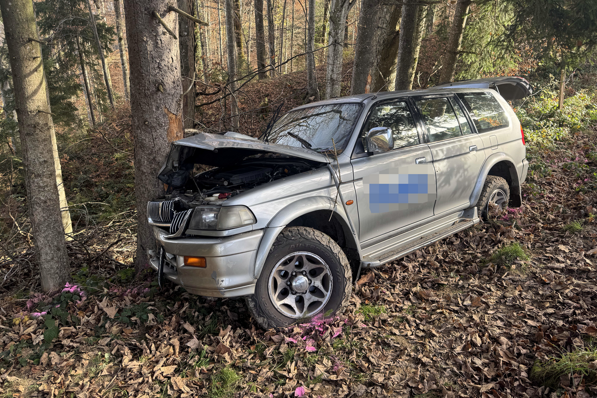 Das Auto prallte im Wald gegen einen Baum (Bildquelle: Stadtpolizei St.Gallen)