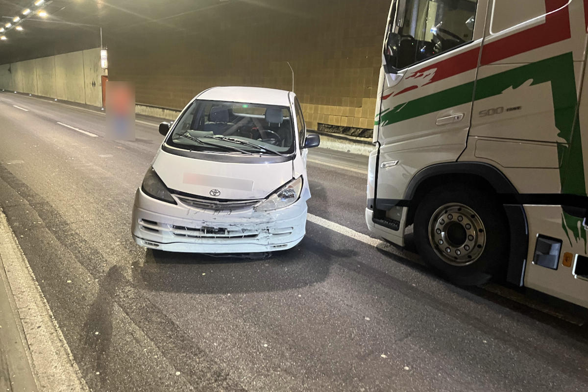 Toyotafahrer bei der Einfahrt im Tunnel mit Sattelschlepper kollidiert. (Bildquelle: Kantonspolizei St. Gallen)