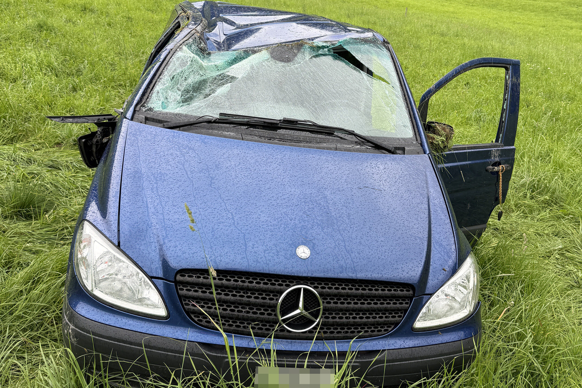 Das Fahrzeug überschlug sich mehrmals und kam nach rund 20 Metern auf dem Wiesland zum Stillstand. Der 40-jährige Fahrzeuglenker und drei weitere Insassen im Alter von 27, 32 und 34 Jahren wurden beim Verkehrsunfall leicht verletzt. Sie wurden mit einem Rettungshelikopter und durch den Rettungsdienst in Spitalpflege gebracht.