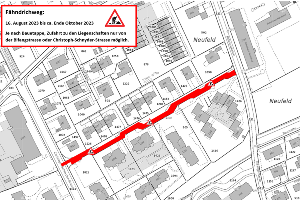 Vom Mittwoch, 16. August 2023 bis ca. Ende Oktober 2023 kommt es im Fähndrichweg Stadt Sursee, zu Bauarbeiten infolge Erneuerung der Wasserleitungen. Die Zufahrt zu den Liegenschaften entlang des Fähndrichweg ist je nach Bauetappe nur von der Bifangstrasse bzw. Christoph-Schnyder-Strasse möglich.