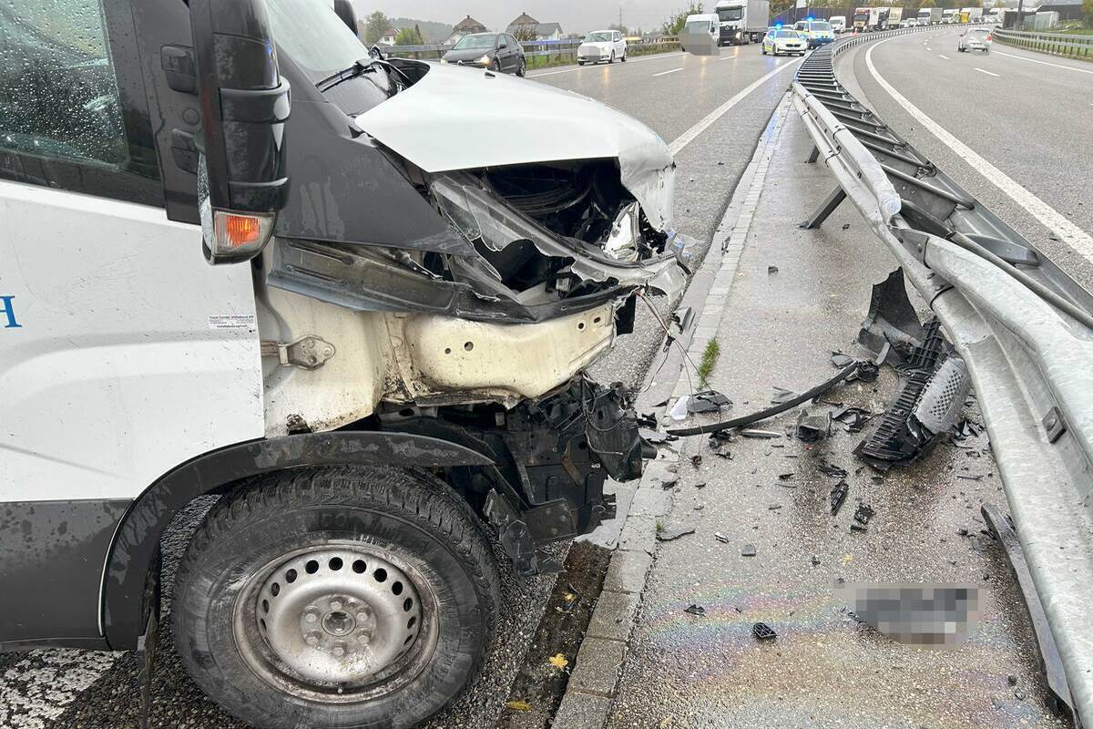 Der Lieferwagen prallte auf der A2 bei Strengelbach in die Leitplanke (Bildquelle: Kantonspolizei Aargau)